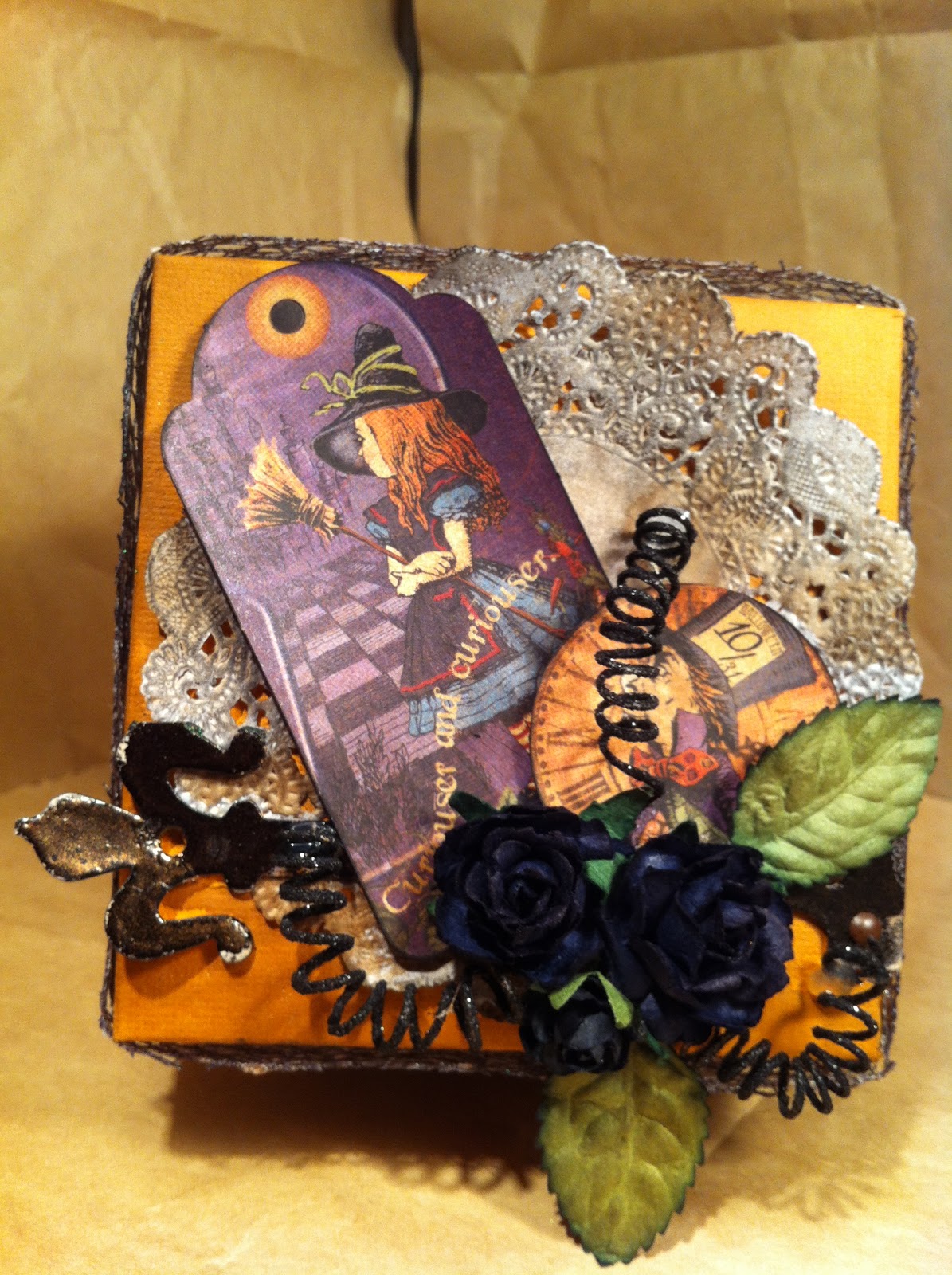 Like so many people I know, I love pattern paper. I particularly love Graphic 45. But also like many I struggle with the idea of using this awesome paper. So, I did. I cut 2 12x12 sheets and I created my very own Halloween in Wonderland Surprise box (also known as exploding box). With my centre piece being the tree. Hiding in the tree is the Cheshire cat, because, well where else would he be?
